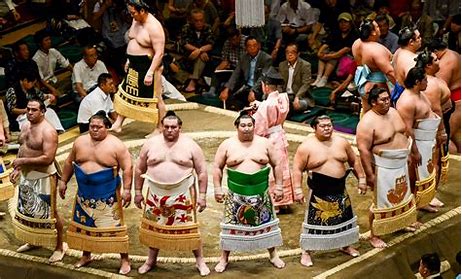 Clash of Titans: A vibrant display of sumo wrestlers locked in a traditional contest of